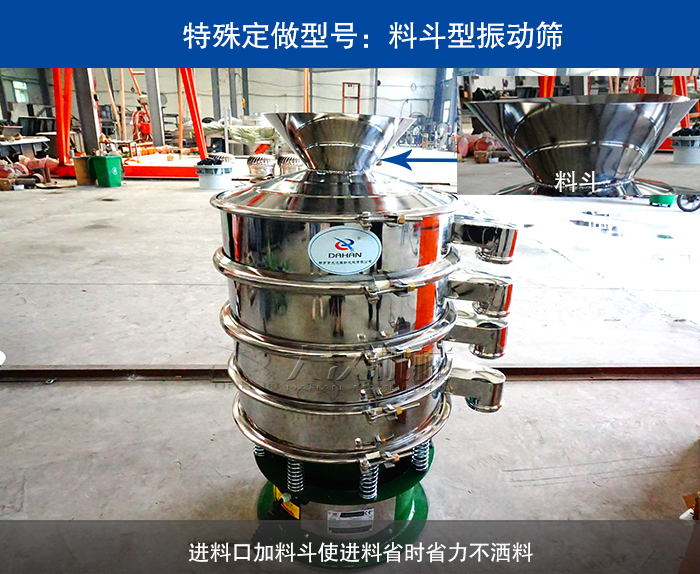 進料口加料斗型振動篩是在普通振動篩的進料口上蓋上加裝一個漏斗型的進料斗,可以在人工加料時節(jié)省時間力氣并且進料過程中不會灑料造成物料的浪費。