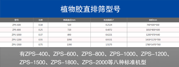 植物膠篩分使用的直排篩為單層篩分設備,它的直徑同旋振篩一樣,有ZPS-400、ZPS-600、ZPS-800、ZPS-1000、ZPS-1200、ZPS-1500、ZPS-1800、ZPS-2000等八種標準機型。