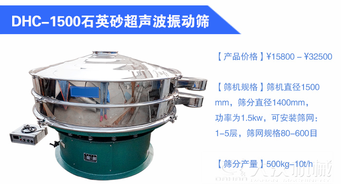 超聲波振動(dòng)篩常規(guī)型號(hào)有:DHC-400、DHC-600、DHC-800、DHC-1000、DHC-1200、DHC-1500、DHC-1800、DHC-2000等。根據(jù)每小時(shí)10噸的篩分產(chǎn)量,您使用直徑1500mm和直徑1800mm的超聲波振動(dòng)篩就可以完成產(chǎn)量要求。下面小編就為您重點(diǎn)介紹一下這兩個(gè)型號(hào)的振動(dòng)篩。