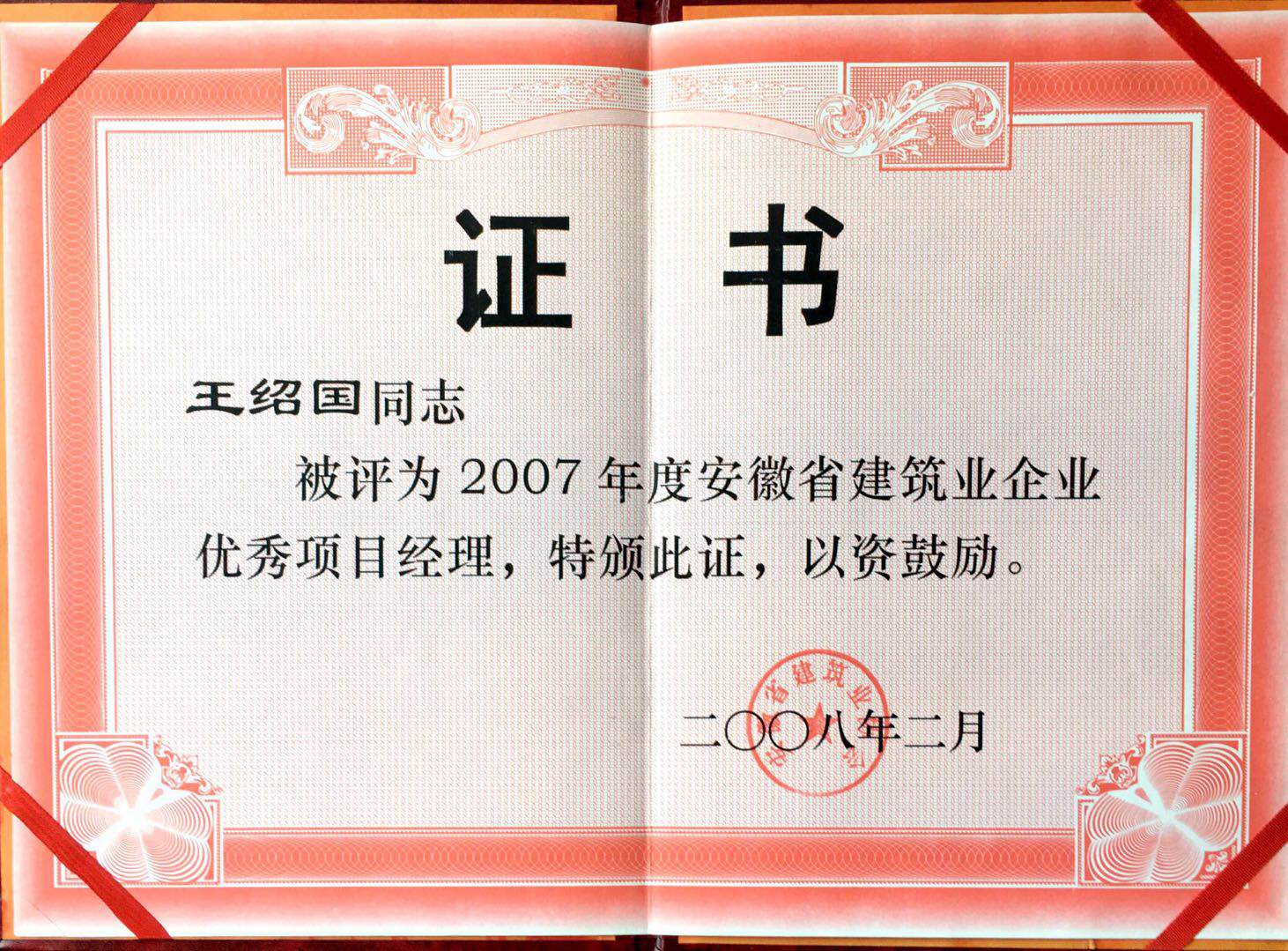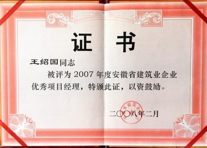 >2007年度安徽省建筑業優秀項目經理王紹國