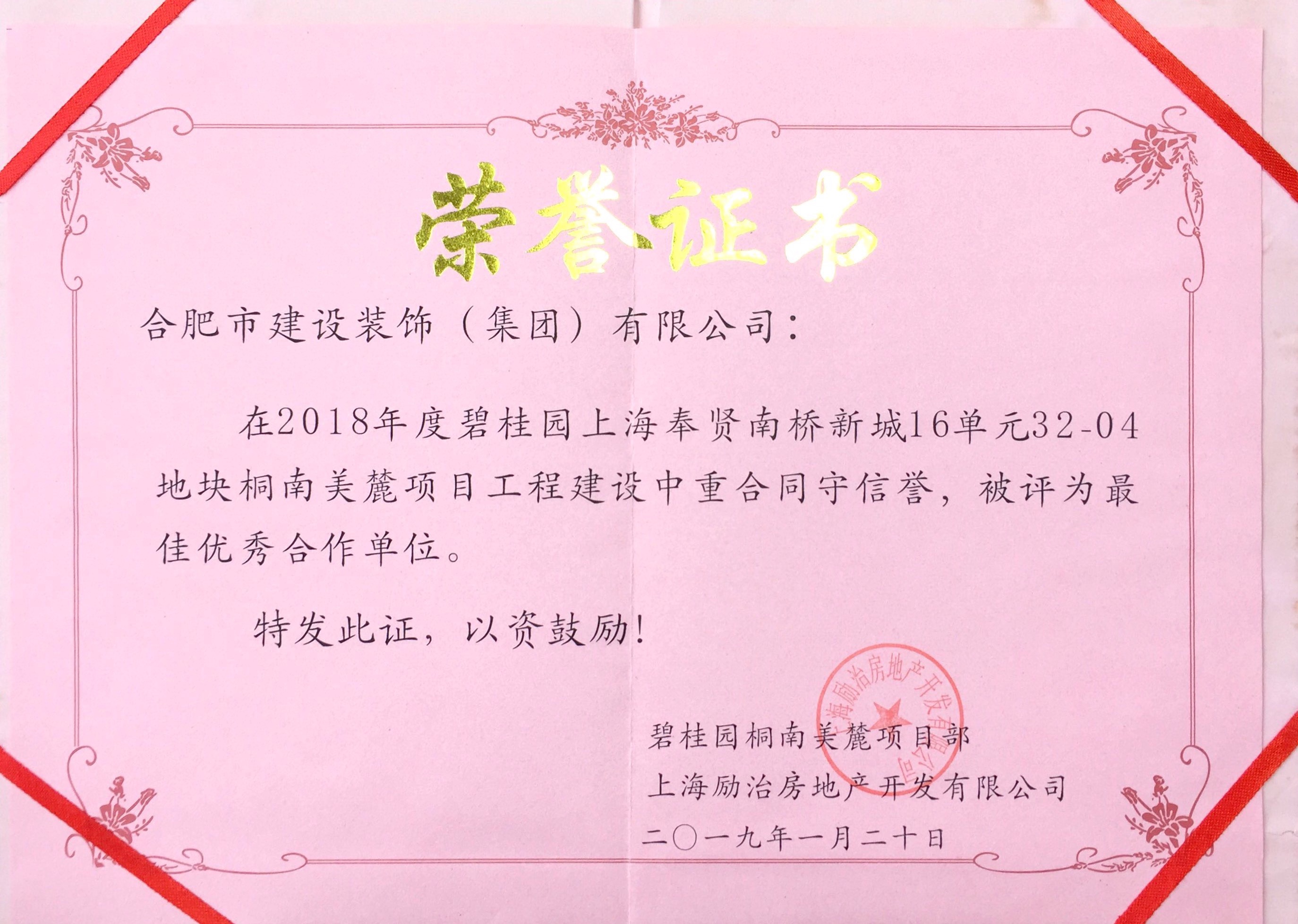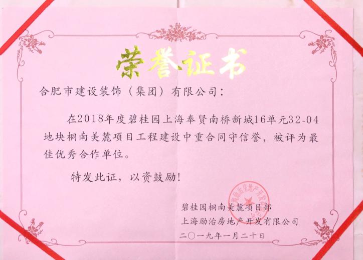>2018年度碧桂園上海奉賢南橋新城16單元32-04地塊桐南美麓項(xiàng)目工程建設(shè)者重合同守信譽(yù),被評(píng)為最佳優(yōu)秀合作單位