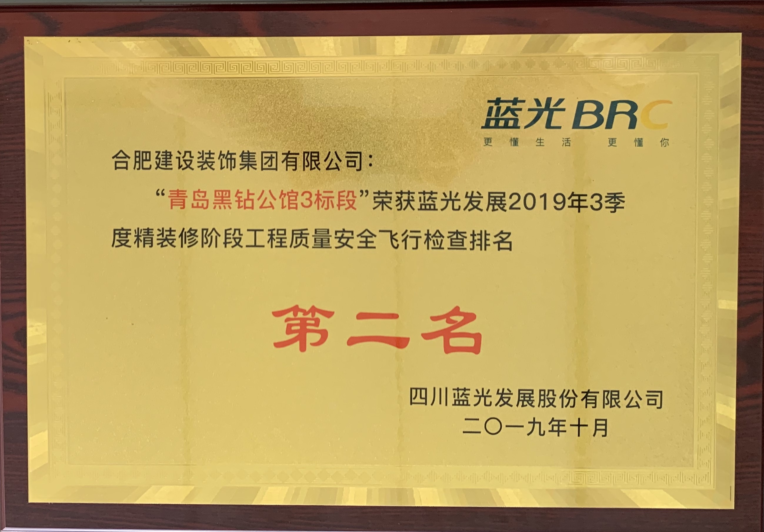 >青島黑鉆公館3標段榮獲藍光發展2019年3季度精裝修階段工程質量安全飛行檢查排名第二名