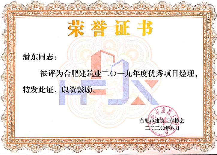 >合肥市建筑業(yè)2019年度優(yōu)秀項目經(jīng)理——潘東