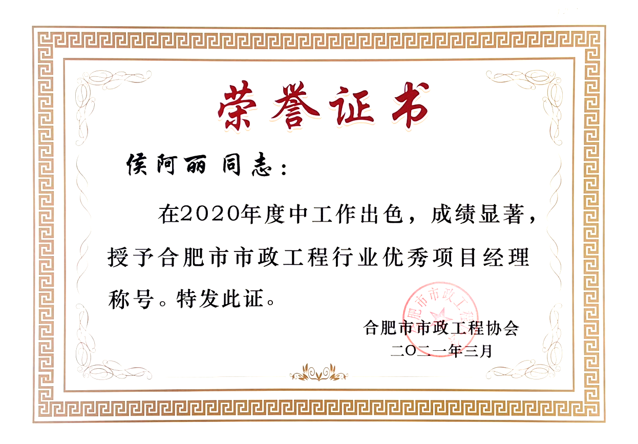 >2020年度合肥市市政工程行業優秀項目經理——侯阿麗