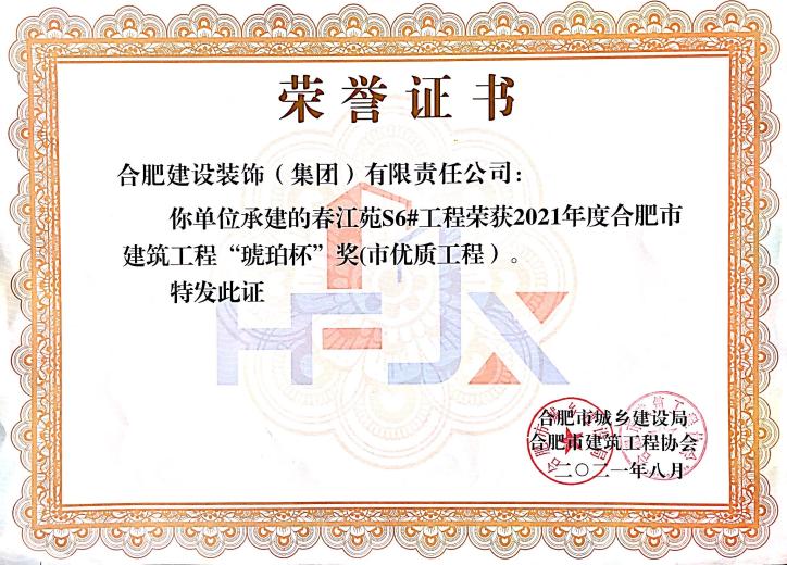 >春江苑S6#--2021年度合肥市建筑工程“琥珀杯”獎(市優質工程)