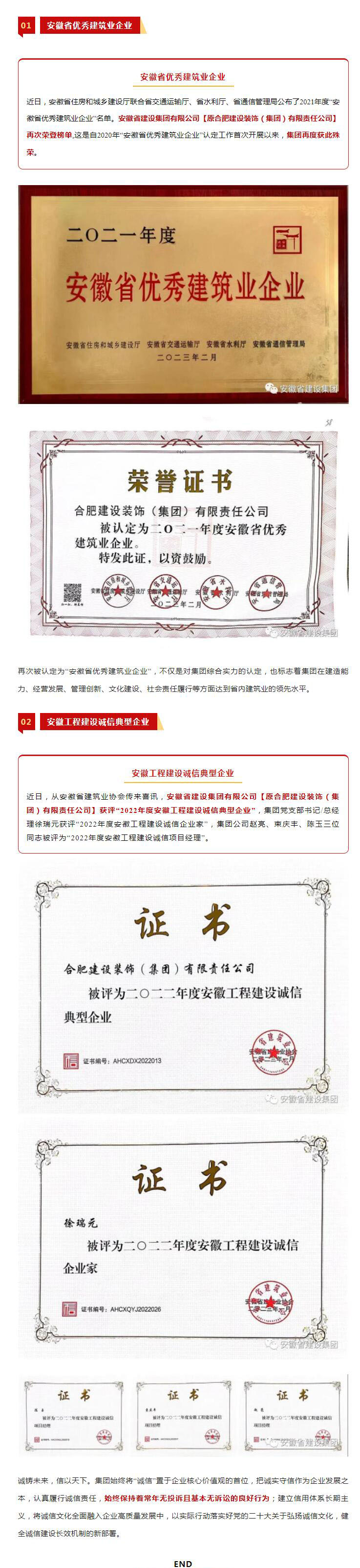 >喜報 | 集團再次榮獲“安徽省優秀建筑業企業”等多項榮譽