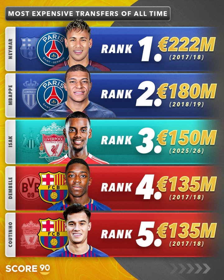 足壇歷史最貴TOP10:內姆前二,伊薩克躍居第三!利物浦2人上榜