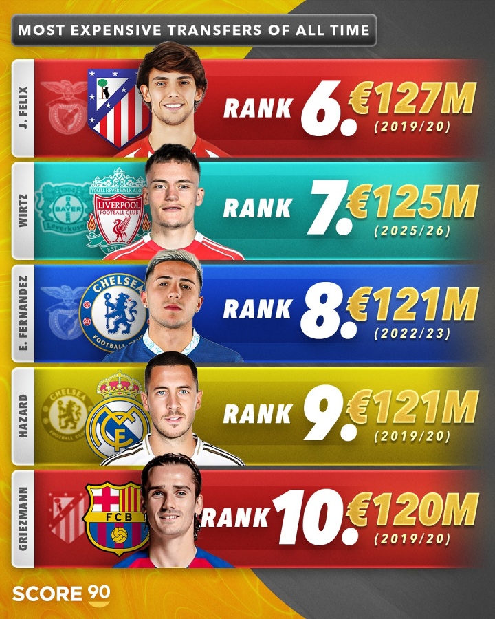 足壇最貴轉會費TOP10: