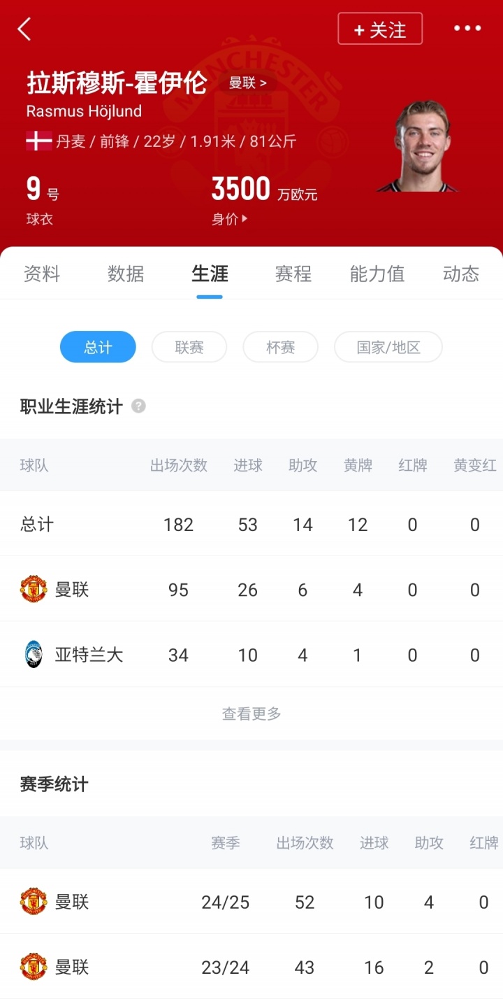 霍伊倫現年22歲,曼聯2023年夏天花費7780萬歐從亞特蘭大引進霍伊倫。在曼聯的兩個賽季,霍伊倫共代表球隊出戰95場比賽,貢獻26球6助攻。目前,霍伊倫的德轉身價為3500萬歐。