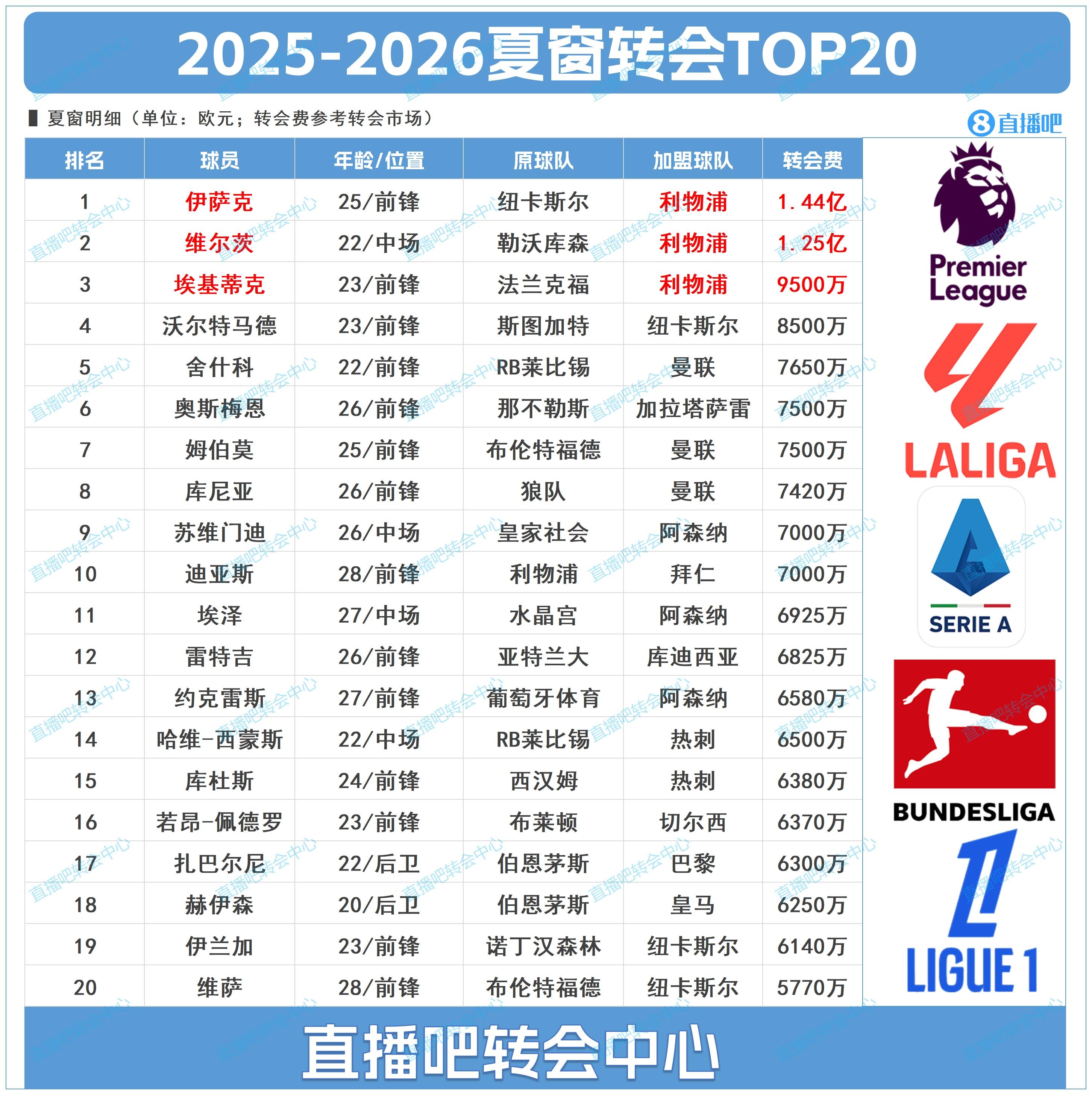 2025夏窗轉會TOP20【注:數據參考德國轉會市場網】