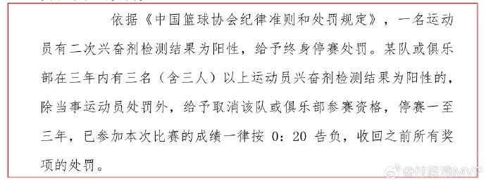 根據中國籃協今天公布的《中國籃球協會籃球運動隊參賽指引)(意見征集稿)顯示:“如果一名籃球運動員有二次興奮劑檢測結果為陽性,給予終身停賽處罰。某隊或俱樂部在三年內有三名(含三人)以上運動員興奮劑檢測結果為陽性的,除當事運動員處罰外,給予取消該隊或俱樂部參賽資格,停賽一至三年,已參加本次比賽的成績一律按 0:20 告負,收回之前所有獎項的處罰。