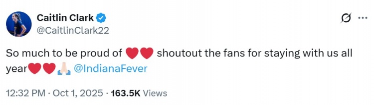 賽后,因傷賽季報銷的狂熱球星凱特琳-克拉克更推鼓勵球隊,她寫道:“滿滿的驕傲 ???? 感謝球迷們一年來的陪伴與支持 ???????? @印第安納狂熱!”