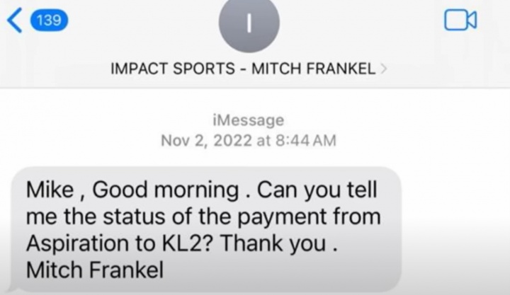 Torre曬出了幾段手機短信截圖,內容是萊昂納德經紀人米奇-弗蘭克爾向Aspiration公司的法律顧問了解給萊昂納德付款的情況。這意味著萊昂納德存在場外虛假代言的陰陽合同一事,并非萊昂納德舅舅丹尼斯-羅伯森一人所為,萊昂納德經紀人也了解其中的情況。弗蘭克爾是萊昂納德團隊里真正的持證、注冊、認證經紀人。