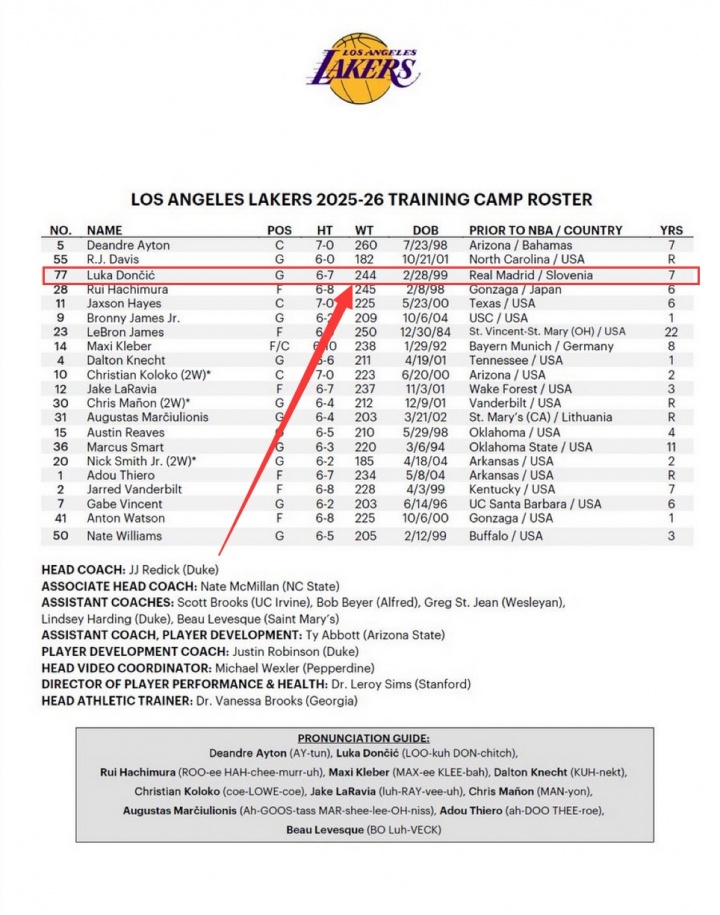 ??湖人訓練營名單東契奇體重244磅 上賽季開賽230磅&最高270磅