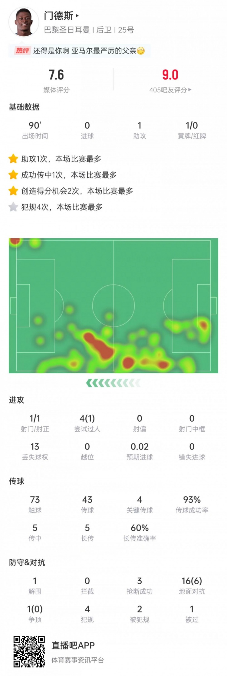 此役努諾-門德斯踢滿全場送出助攻,幫助巴黎取勝,他當選本場比賽最佳球員。