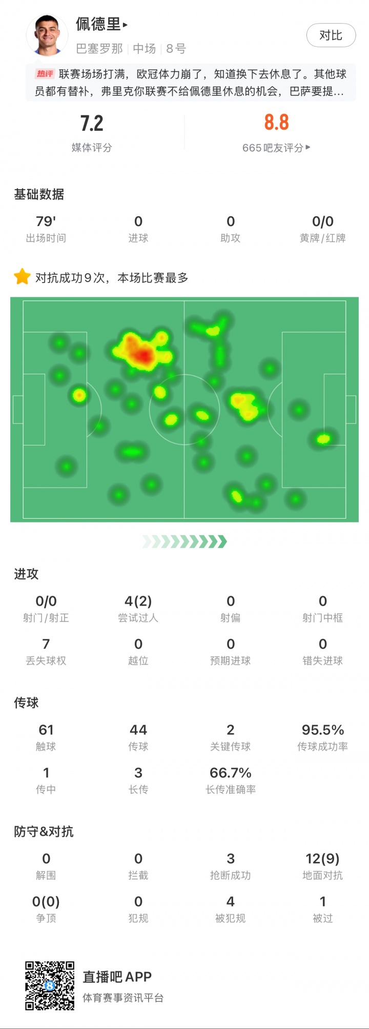 本場比賽,佩德里出戰79分鐘獲評7.2分,4次嘗試過人2次成功,7次丟失球權,61次觸球,44次傳球42次成功,傳球成功率95.5%,2次關鍵傳球,3次長傳2次成功,長傳準確率66.7%,3次搶斷成功,12次地面對抗9次成功(全場最多),4次被犯規,1次被過。
