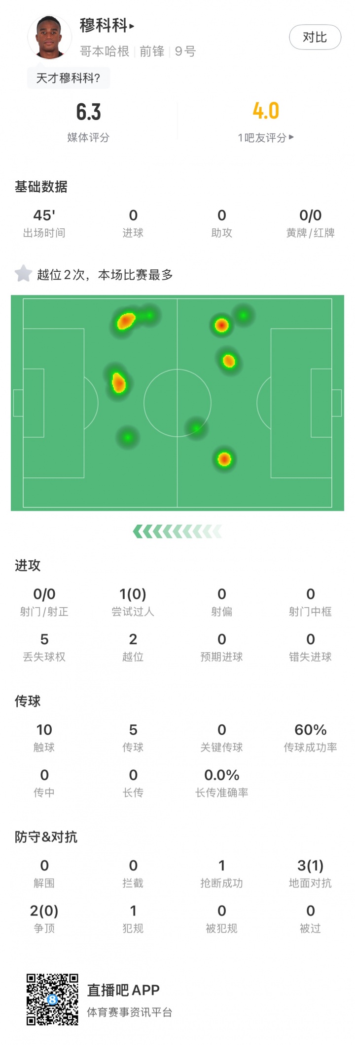 效力于哥本哈根的前鋒穆科科此役出戰半場便被換下。半場無射門越位兩次,10次觸球,5次傳球,5次丟失球權,傳球成功率60%。