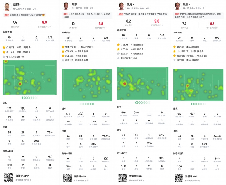 當爹又當媽!32歲凱恩新賽季4場6球2助,熱區圖覆蓋到己方禁區