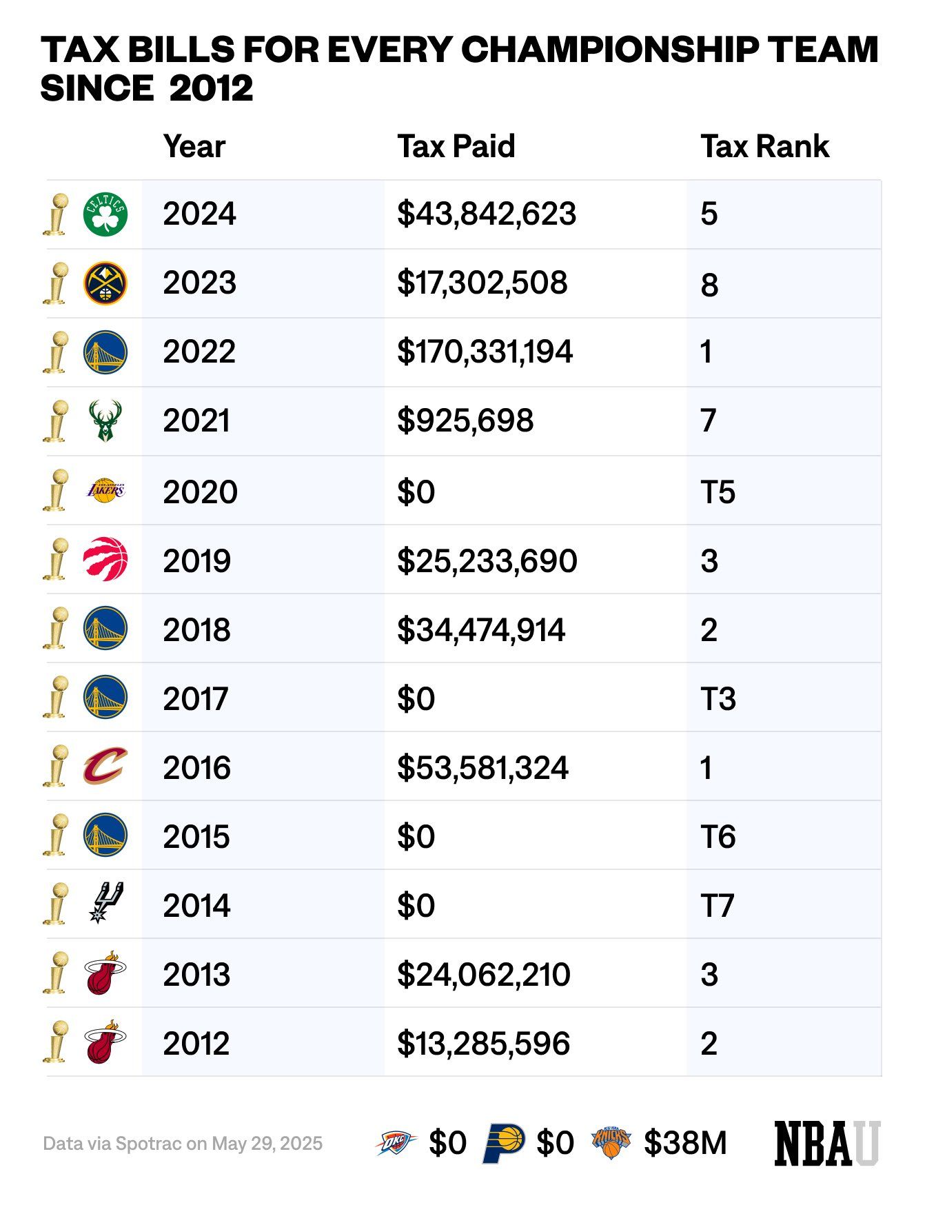 自12年以來各冠軍隊奢侈稅賬單&排名:22勇士1.7億高居第一??