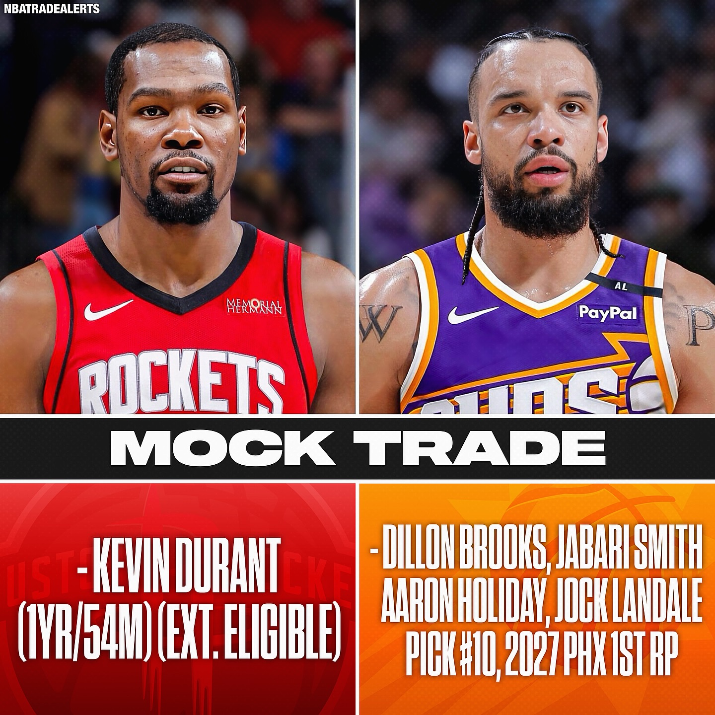 火箭送出狄龍+小賈+霍勒迪+蘭代爾+今年10號簽+27年首輪得到杜蘭特3年7000萬重簽范喬丹 3年4000萬重簽亞當斯...