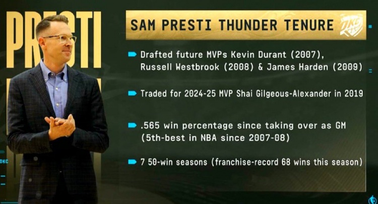 美媒列普雷斯蒂雷霆GM履歷:選中3MVP+交易來1MVP 7個賽季50+勝