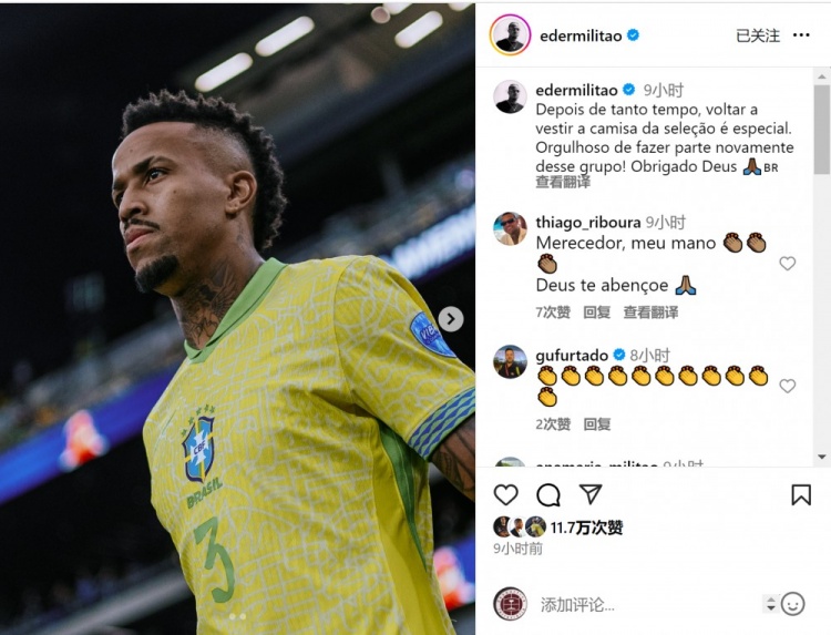 時(shí)隔一年回歸!米利唐社媒:很自豪重返巴西隊(duì),這種感覺很特別