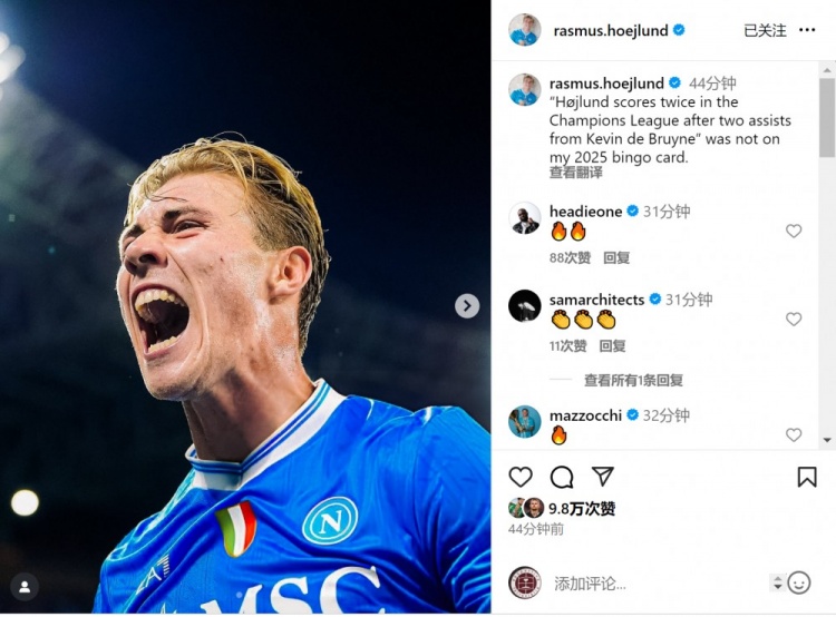 10月2日訊 歐冠聯賽階段第二輪比賽,霍伊倫梅開二度,那不勒斯主場2-1擊敗葡萄牙體育。霍伊倫社媒曬出慶祝進球的照片,并...