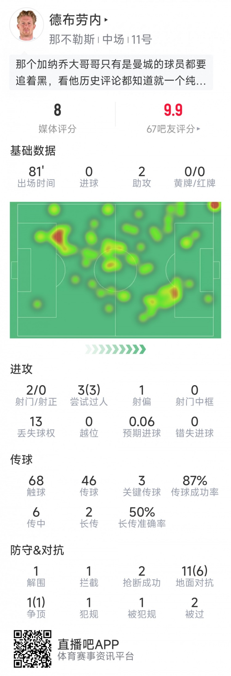 10月2日訊 在本輪歐冠那不勒斯對陣葡萄牙體育的比賽中,德布勞內(nèi)助攻雙響,以下為他在本場數(shù)據(jù):比賽時間81分鐘2次助攻...