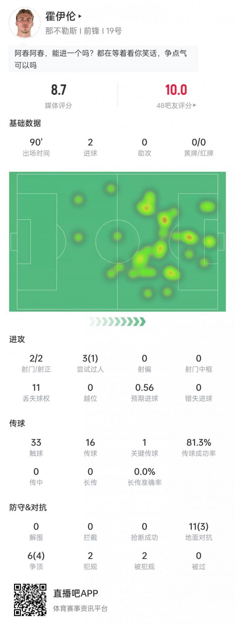 雙響!霍伊倫本場數(shù)據(jù):2次射門進(jìn)2球,6次爭頂4次成功,評分8.7
