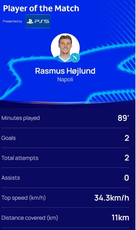 梅開二度,官方:霍伊倫當(dāng)選那不勒斯2-1葡萄牙體育全場最佳