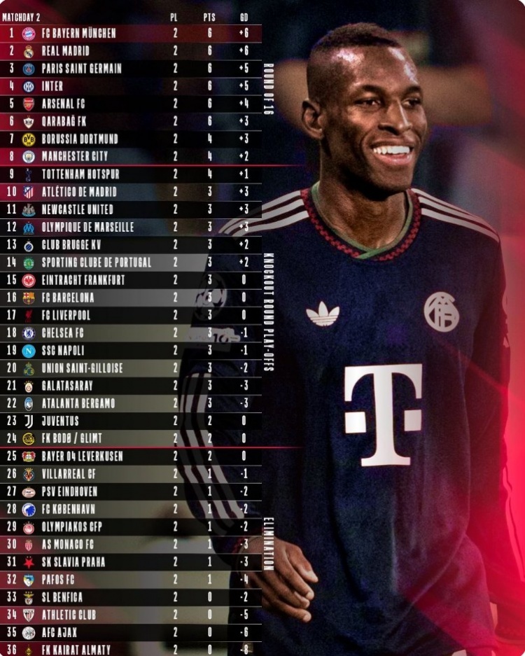 拜仁官推曬兩輪過后歐冠積分榜:拜仁以進(jìn)球優(yōu)勢領(lǐng)跑,皇馬次席
