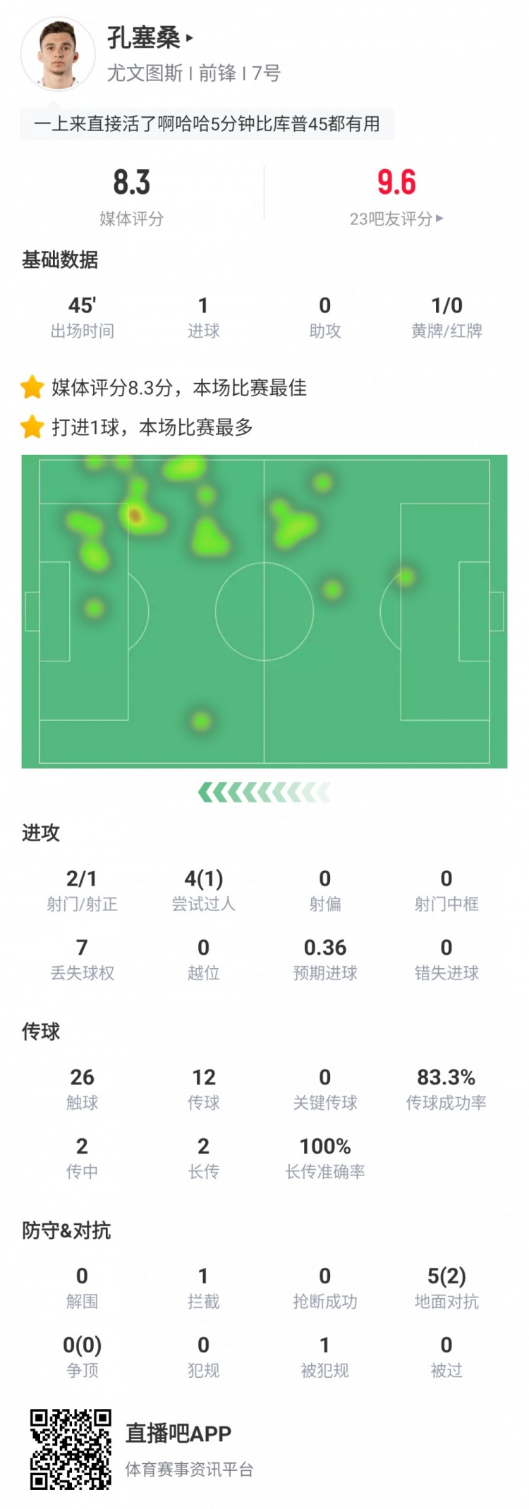 小孔塞桑本場數(shù)據(jù):下半場替補(bǔ)出場打進(jìn)1球,評分高達(dá)8.3分