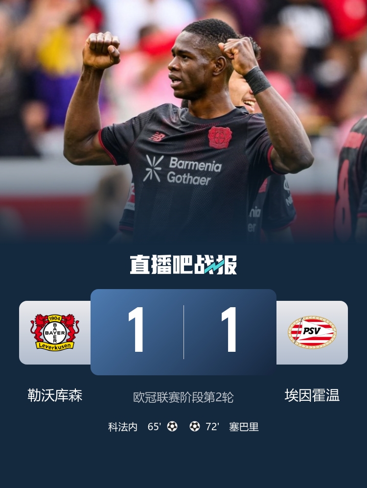 兩連平!歐冠-勒沃庫森1-1埃因霍溫 格里馬爾多中柱科法內(nèi)破門
