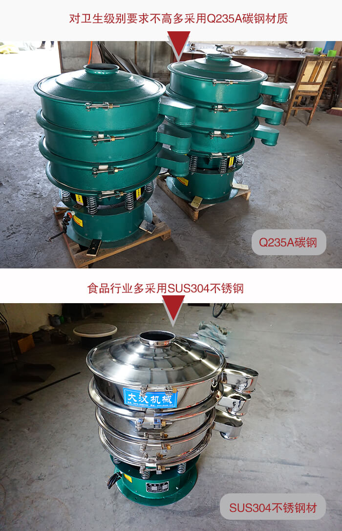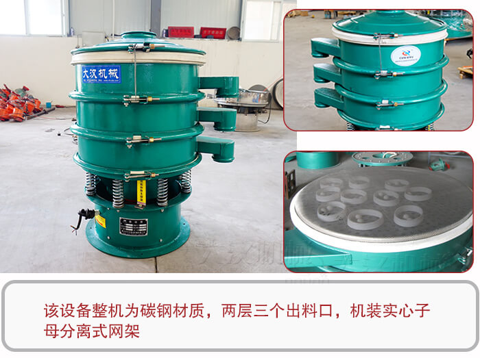 該設(shè)備整機(jī)為碳鋼材質(zhì),兩層三個出料口,機(jī)裝實心子母分離式網(wǎng)架,歸屬于常見的輕型振動篩分設(shè)備,也就三次元振動篩,碳鋼振動篩,本公司生產(chǎn)的DH系列振動篩可根據(jù)客戶不同需求1-5層同時使用,產(chǎn)品型號齊全,可滿足各種粉末、顆粒篩分需要求及液體過濾需求,也可設(shè)計為超聲波振動篩粉機(jī)、氣流振動篩粉機(jī)、振動篩粉機(jī)等機(jī)型。食品行業(yè)多多采用SUS304不銹鋼,對衛(wèi)生級別要求不高多采用Q235A碳鋼作為主要材質(zhì)。