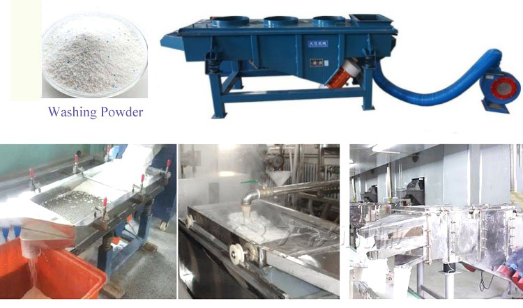 大漢機械降溫直線振動篩這對高溫特性物料設(shè)計研發(fā),可在有效降低物料溫度后再對物料進(jìn)行篩分,有效的提高了篩分效率及處理量,下面以洗衣粉為例說明風(fēng)冷式振動篩的應(yīng)用。洗衣粉在剛剛完成生產(chǎn)后,通常為120度左右的高溫,如不進(jìn)行降溫處理,篩選分級非常困難,而洗衣服不適合傳統(tǒng)的水冷式降溫。在洗衣粉生產(chǎn)線上用“大漢牌”風(fēng)冷式直線振動篩,剛生產(chǎn)完成120度高溫洗衣粉通過輸送設(shè)備直接進(jìn)入風(fēng)冷式直線振動篩,經(jīng)過安裝在設(shè)備進(jìn)料口底部的風(fēng)機降溫冷卻系統(tǒng),(不符合要求的結(jié)塊物料通過安裝在進(jìn)料口端的篩網(wǎng)篩選后從出料口旁的小型排料口排出,見下圖,該裝置可根據(jù)物料特性選裝),可直接將洗衣粉溫度降至40-50度后再進(jìn)入直線振動篩完成篩選分級工作。