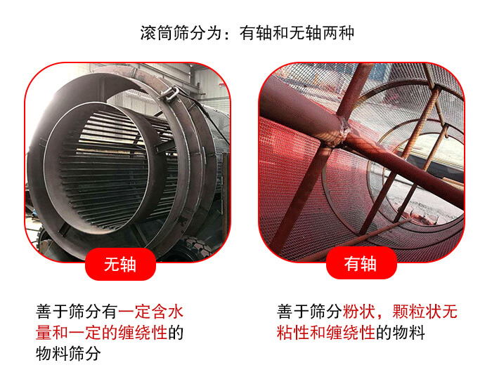 2,根據(jù)所篩分的物料選擇不同結(jié)構(gòu)的產(chǎn)品,對(duì)于滾筒篩大致能夠分為:有軸和無(wú)軸兩種,有軸的善于篩分粉狀,顆粒狀無(wú)粘性和纏繞性的物料。無(wú)軸的則是和一些有一定含水量和一定的纏繞性的物料篩分。