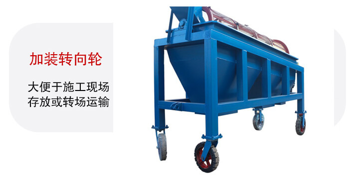 設(shè)備的整體性較高加裝轉(zhuǎn)向輪,便于施工現(xiàn)場(chǎng)存放或轉(zhuǎn)場(chǎng)運(yùn)輸,可拆卸的部件只有成品堆料皮帶機(jī),松開底部固定螺栓和吊掛鋼絲繩,將成品皮帶機(jī)塞入主框架底面即可。