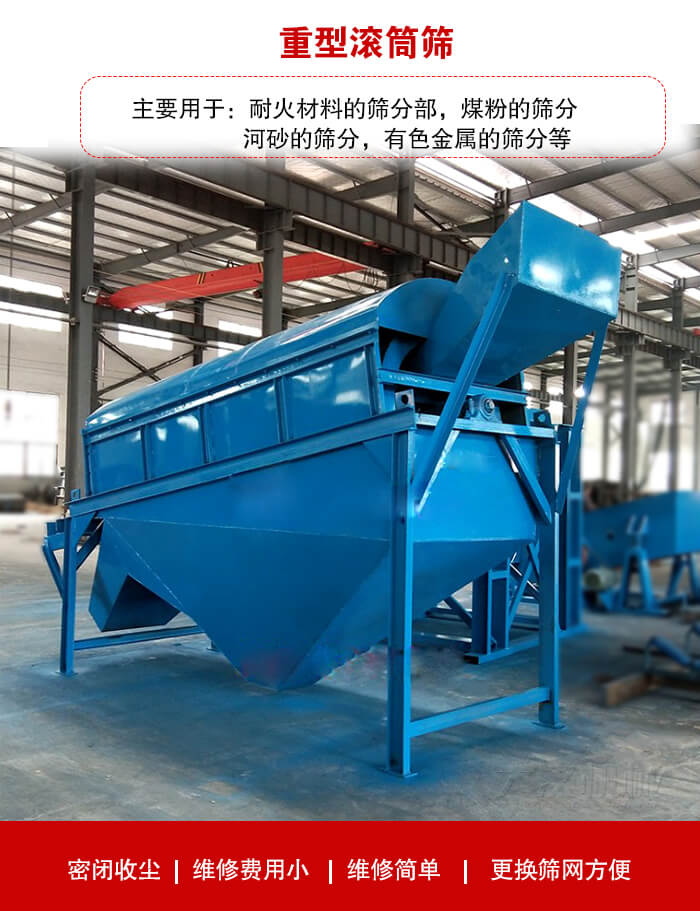 重型滾筒篩主要用于:耐火材料的篩分部,煤粉的篩分,河砂的篩分,有色金屬的篩分等。具有密閉收塵,維修費(fèi)用小,維修簡單,更換篩網(wǎng)方便等特點(diǎn)根據(jù)不同用戶的篩分需求選擇:單層滾筒篩:主要分離出兩種粒度的物料。多層滾筒篩以及單層多段滾筒篩:可分離多種粒度的物料。