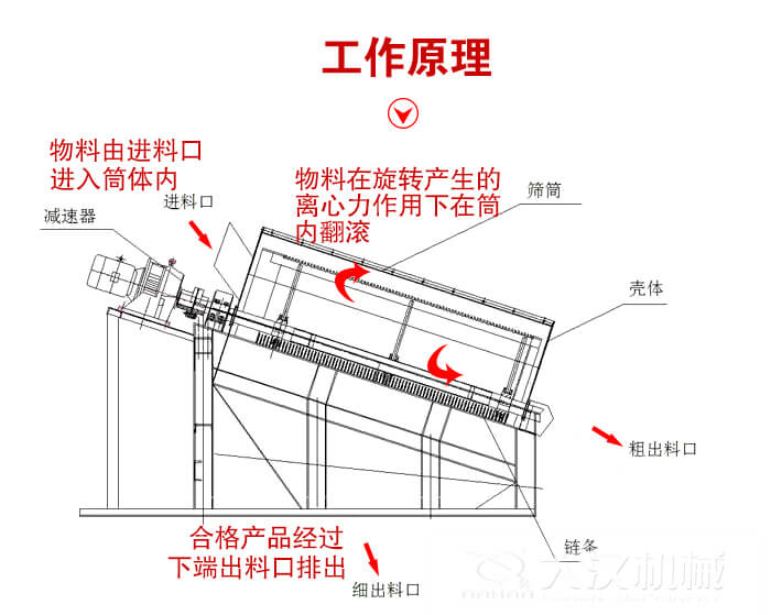 電機(jī)驅(qū)動滾筒軸線作旋轉(zhuǎn)運(yùn)動,減速機(jī)調(diào)節(jié)筒體以一定的轉(zhuǎn)速旋轉(zhuǎn),物料由進(jìn)料口進(jìn)入筒體內(nèi),在旋轉(zhuǎn)產(chǎn)生的離心力作用下,物料在筒內(nèi)翻滾,自上而下通過分級篩網(wǎng)析出,由于篩網(wǎng)分級尺寸不同,物料逐漸被分離篩選,粒度合格的物料經(jīng)篩分后落入到各自的漏斗,然后由人力方式運(yùn)出或通過輸送機(jī)自流送往成品站。合格產(chǎn)品經(jīng)過下端出料口排出,顆粒較大,分選不合格的產(chǎn)品經(jīng)另一排料口排出,筒內(nèi)清理裝置,使篩網(wǎng)不宜被阻塞。
