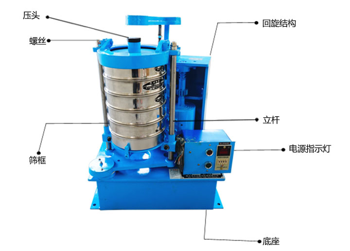 圓手柄,緊固手柄,壓頭,立桿,篩具,螺母,托盤,振動(dòng)體,彈簧,彈簧座,底筒,地腳,殼體,振動(dòng)電機(jī) ,繼電器。