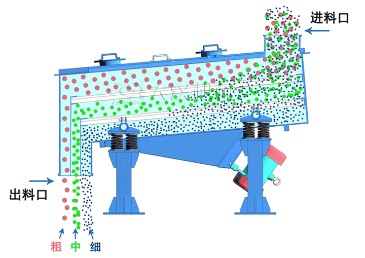 石英砂篩分機利用振動電機激振作為振動源,使物料在篩網(wǎng)上被拋起,同時向前作直線運動,物料從給料機均勻地進入篩分機的進料口,通過多層篩網(wǎng)產(chǎn)生數(shù)種規(guī)格的篩上物、篩下物、分別從各自的出口排出